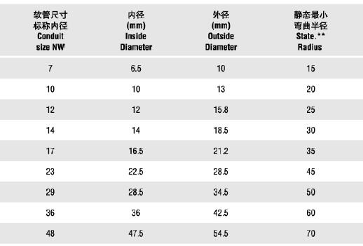 產品規格:型號、軟管尺寸、內徑、外徑、靜態最小彎曲半徑